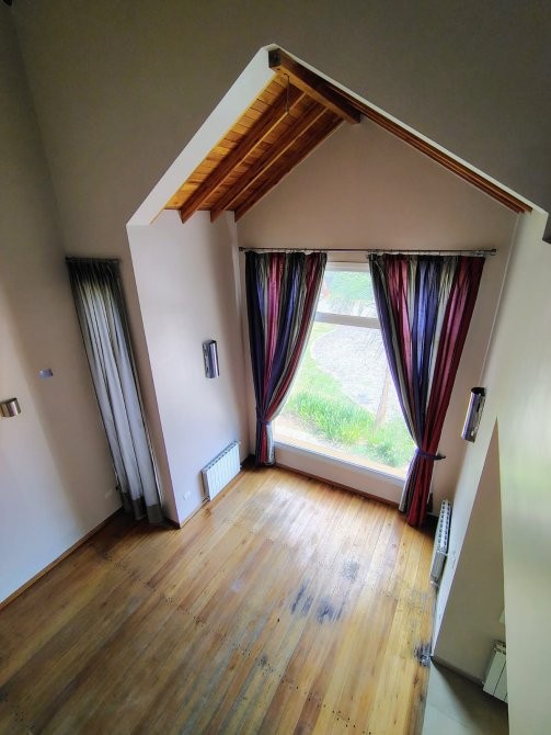 Living en doble altura con hogar a leña, excelente luminosidad y presencia arquitectónica.