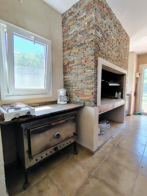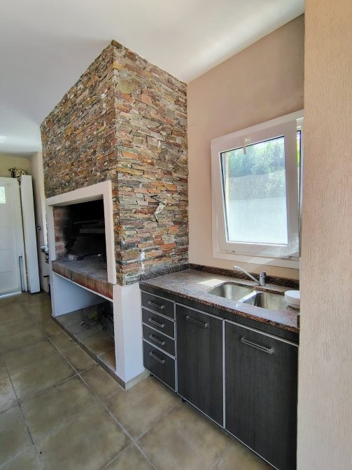 Garage con portón automatizado que funciona también como quincho (parrilla, bacha y mesada).