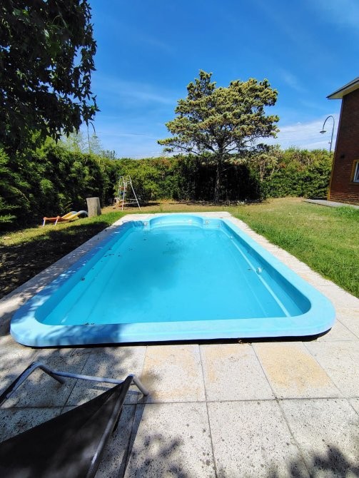 Pileta de fibra con filtro y solárium con baldosas atérmicas.
